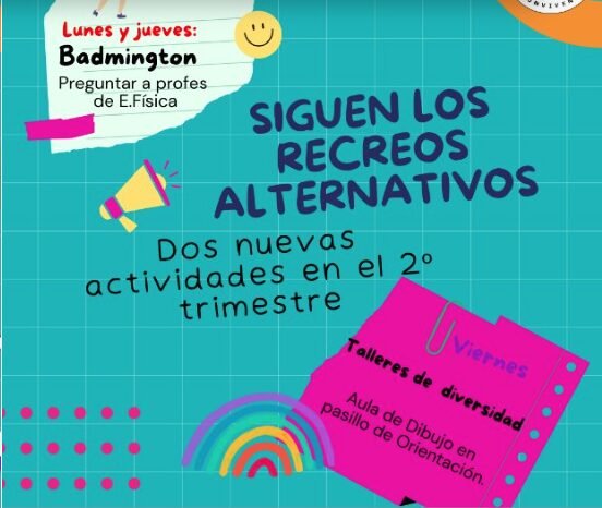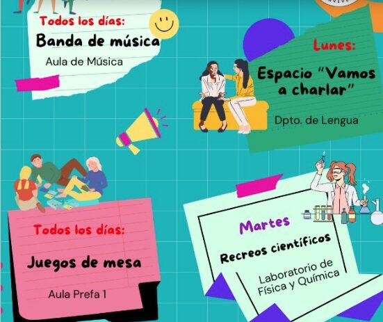 Actualmente nuestro centro, en la hora del patio y/o descanso, cuenta con actividades que se realizan ciertos dĂas de la semana, llevadas a cabo por diferentes miembros de cada Departamento, en los cuales pueden participar todo el alumnado del centro y a esto les llamamos Recreos Inclusivos.